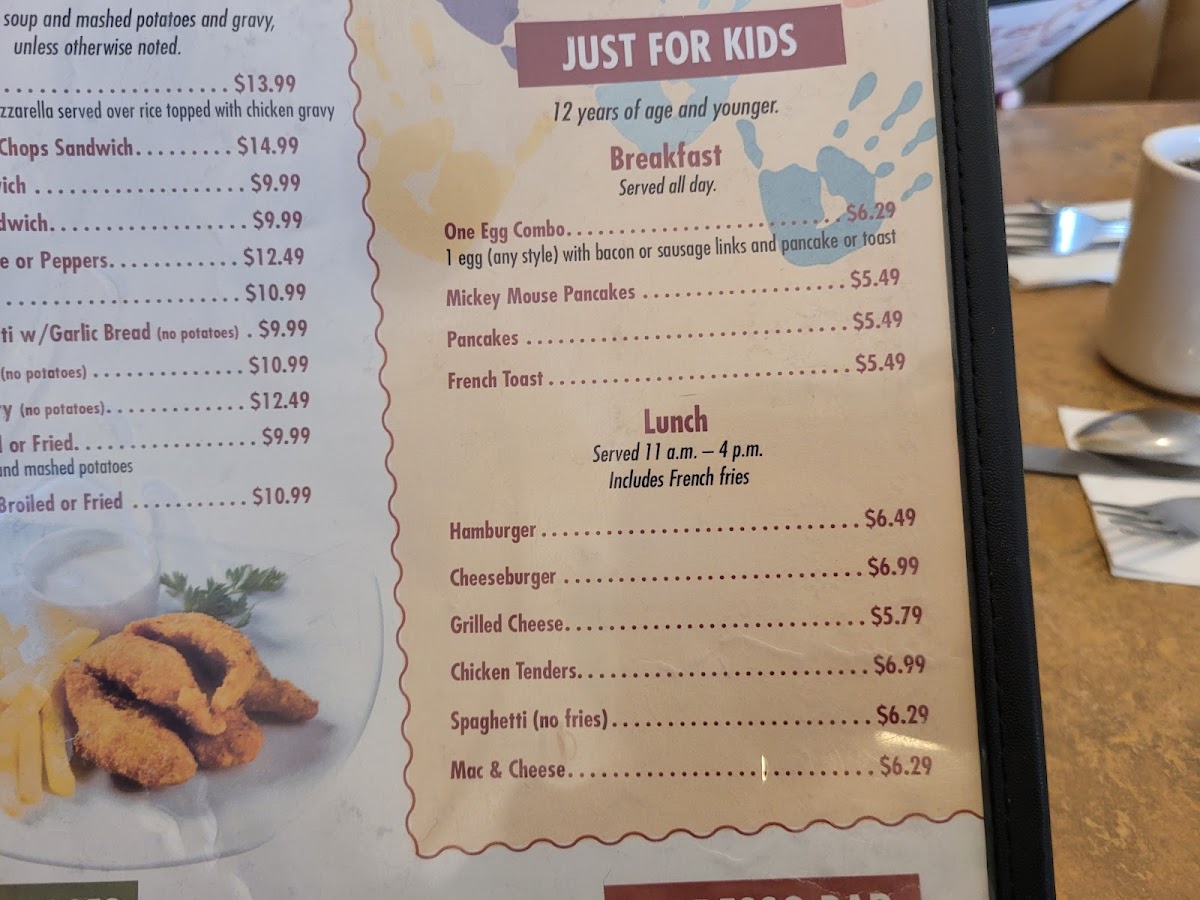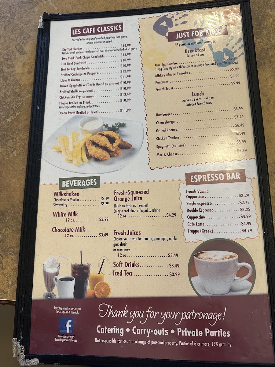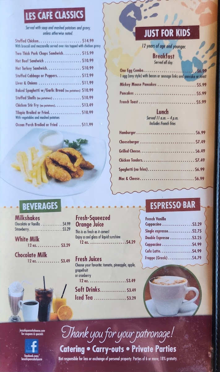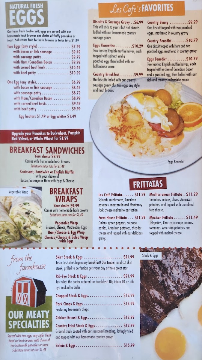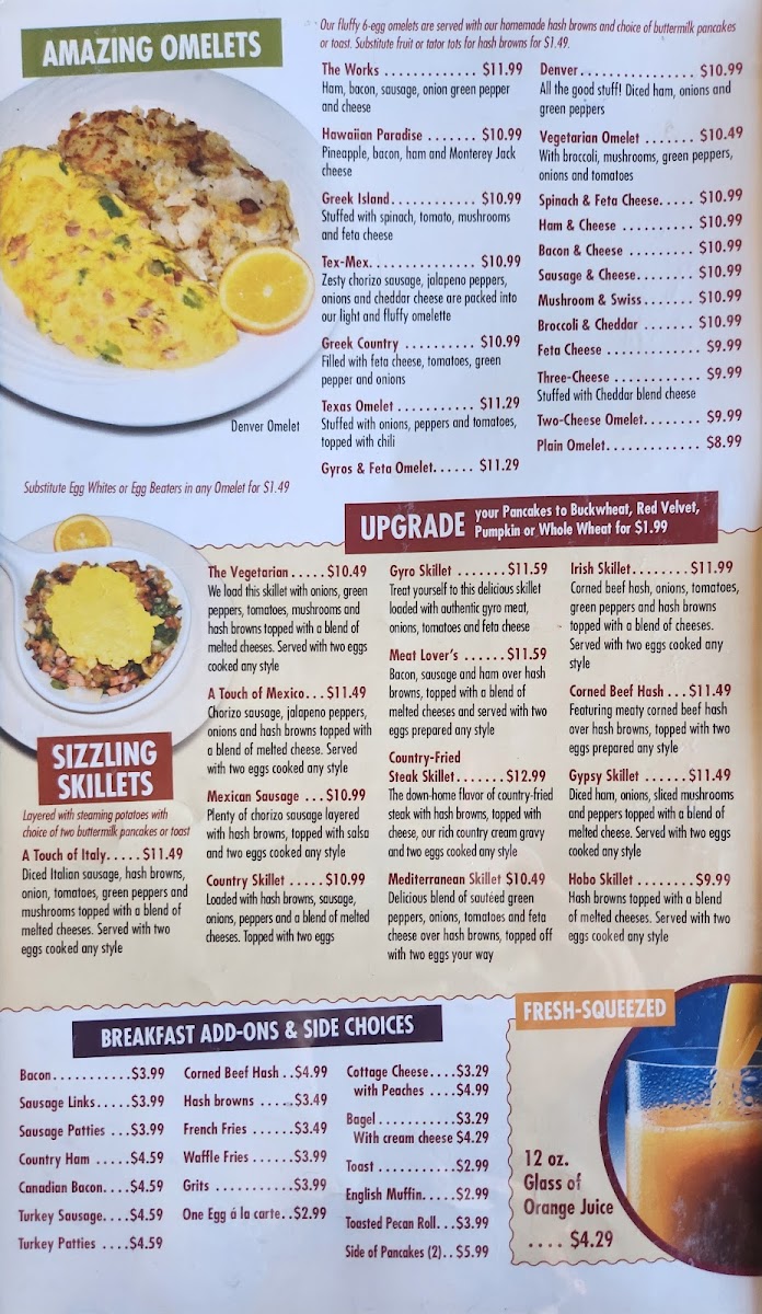 Two eggs, Canadian bacon, choice of egg prep: sunny side up to scrambled with cheese. Select: pancakes, various toasts, or specialty pancakes like pumpkin, red velvet.