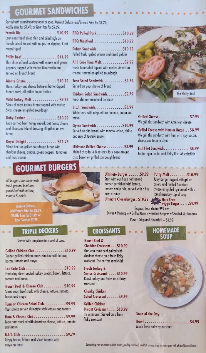 Canadian bacon paired with an egg prepared your way: whites, beaters, scrambled—options with cheddar or American cheese. Choice of pancake or toast variety: buckwheat, pumpkin, red velvet, whole wheat, rye, sourdough, wheat, or white.